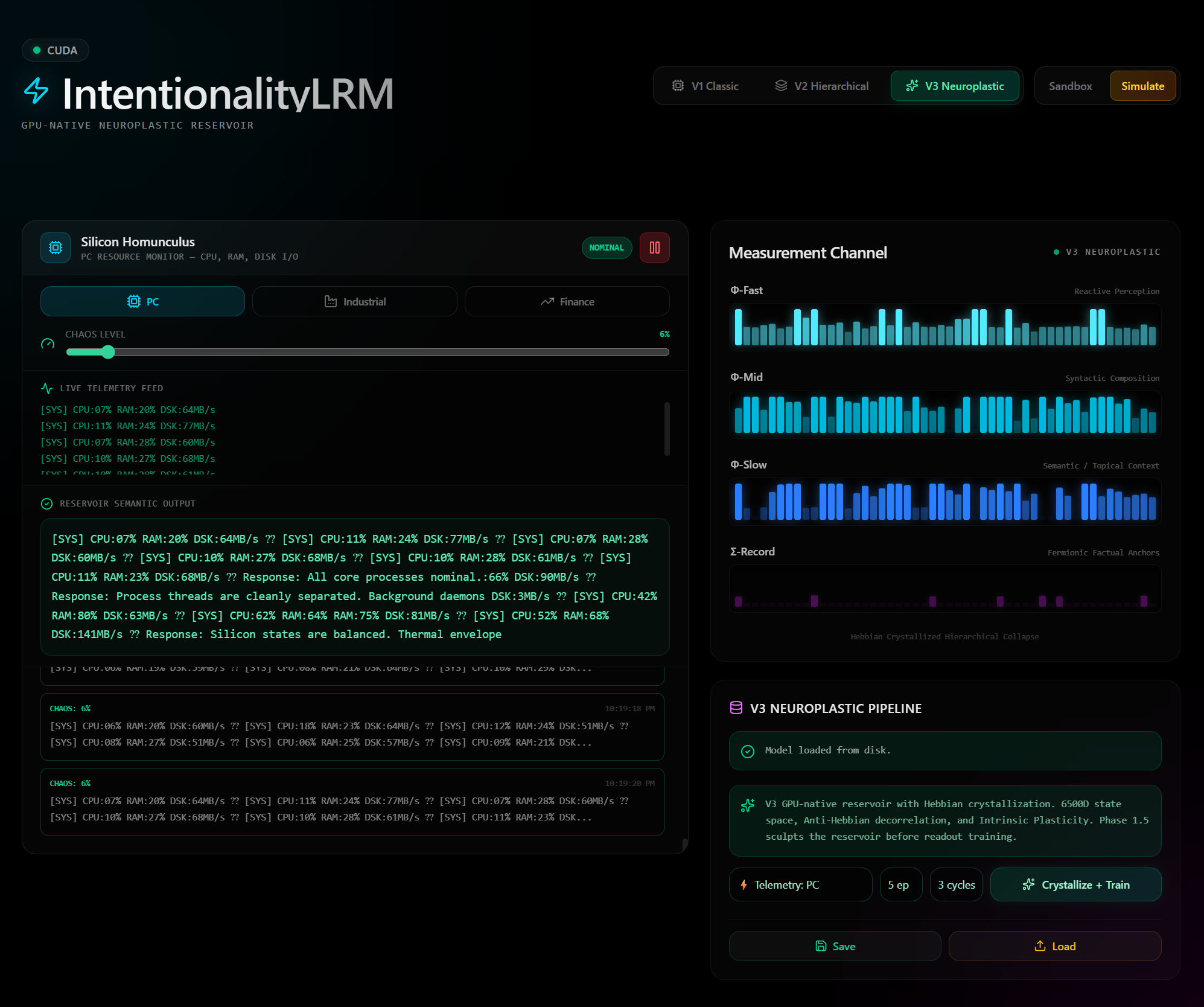 A GPU-native, neuroplastic Language Reservoir Model (LRM) built to simulate biological cytoskeletal dynamics. It features a 6,500-dimensional, 4-layer hierarchical architecture (Φ-Fast, Φ-Mid, Φ-Slow, Σ-Record) that utilizes Hebbian and Anti-Hebbian learning alongside Intrinsic Plasticity. The system uses Jaeger Conceptors to govern intentional state spaces, allowing it to translate chaotic real-time telemetry into coherent semantic responses.